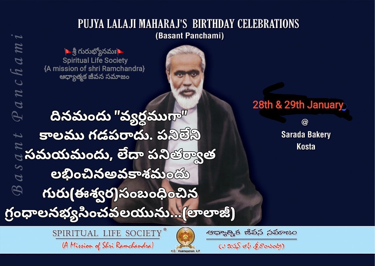 It is called as SPIRITUAL LIFE SOCIETY®, (A Mission of Shri Ramchandra), Visakhapatnam (A.P), India is established as guru dakshina to The Divine Master Babuji Maharaj (Shri Ramchandra Ji of Shahjahanpur U.P.) by True followers/Abhyasis without any monetary gains or ulterior motives, nor any fear or favor, and to forge ahead with a Single Point Agenda, i.e AIMS & OBJECTIVES of BABUJI TO REACH THE HUMANITY AT LARGE.