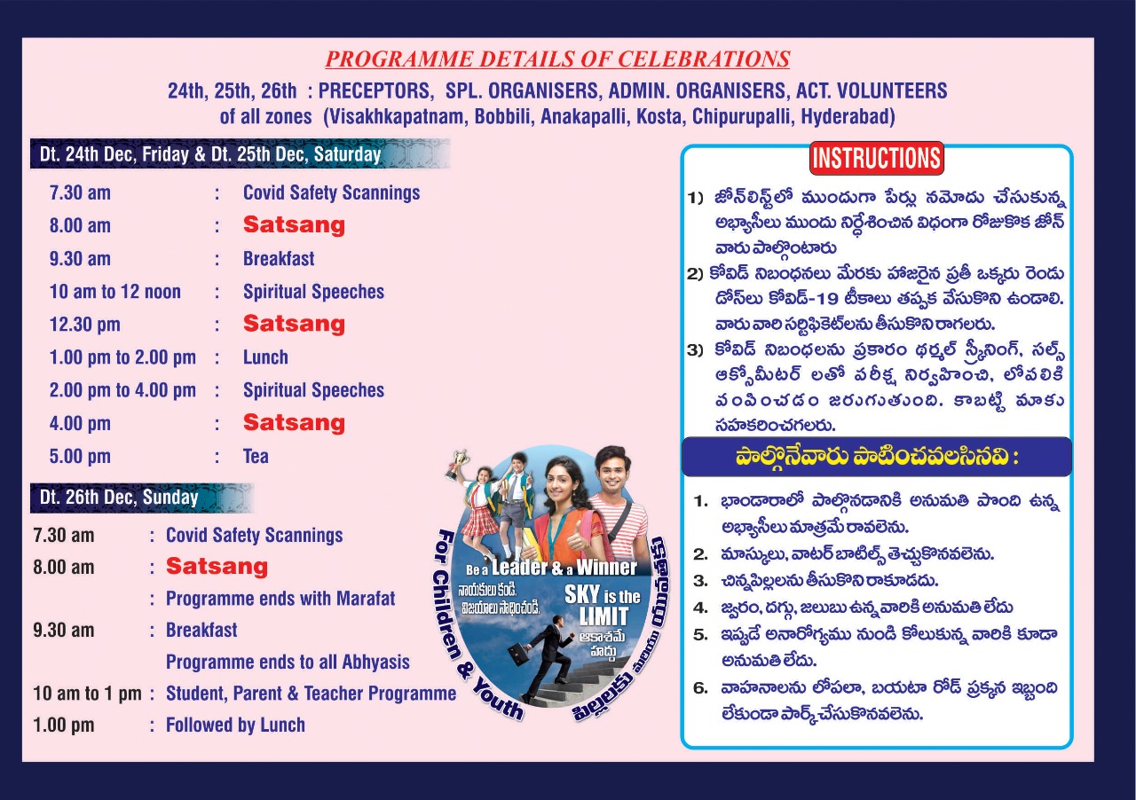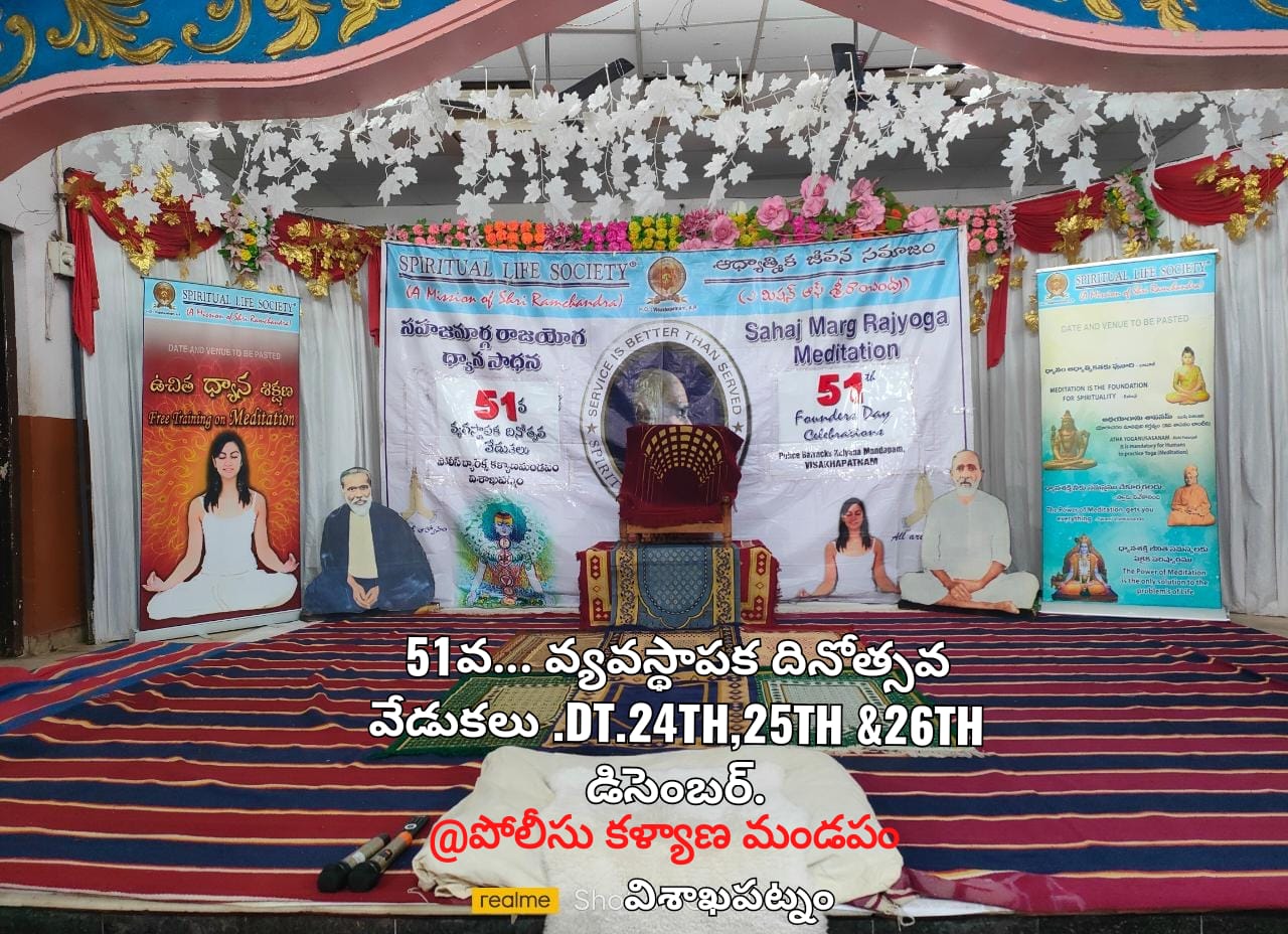 *51వ Foundation day celebrations సందర్భంలో విశాఖ నగరం లో నున్న ఔత్సహికులైన కొన్ని స్కూల్స్ నుండి విద్యార్థులు, ఉపాధ్యాయులు, ప్రిన్సిపాల్స్నీ ఆహ్వానించడం జరిగింది. విద్యార్థులకు నైతిక విలువలు, క్రమశిక్షణ, పిల్లల అలవాట్లు దినచర్య కార్యక్రమములు మొదలైన విషయాలు వివరిస్తూ శ్రీ ఎస్. అర్.మూర్తి గారు ధ్యానం యొక్క విశిష్టత తెలియచేశారు. విద్యార్థులకు క్విట్జ్ పోటీలు నిర్వహించారు. విజేతలకు మరియు ఆయా school principals వారికి బహుమతులు అందజేశారు.*