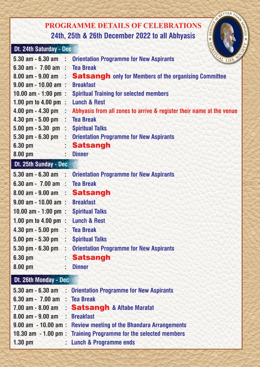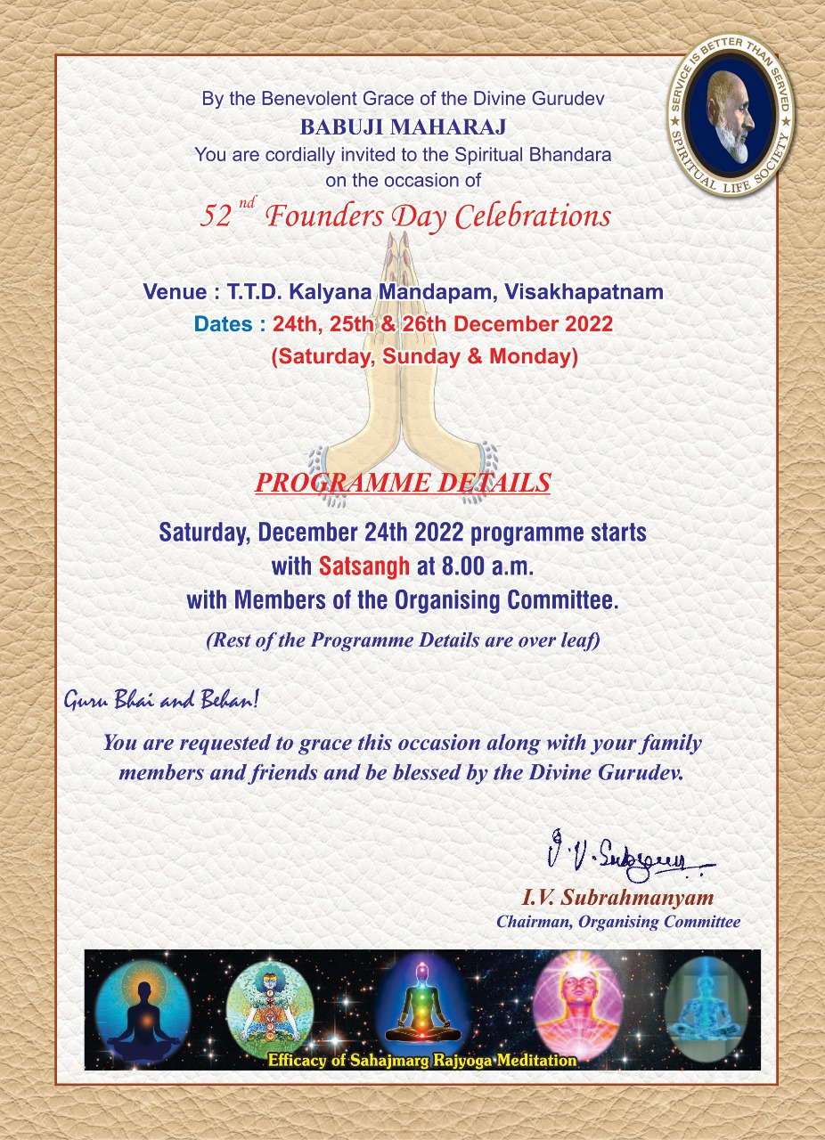 We want no name - We want to be an action without a form & fame. Through our Guru's will, the desire for Name & Fame has not yet crept into our hearts and we dare to say never will. We are instruments and he is the operator. Through these (A team of dedicated Abhyasis) He - Our Divya Gurudev Babuji Maharaj rousing the Spiritual instint in thousands of "Hearts" on this planet earth.