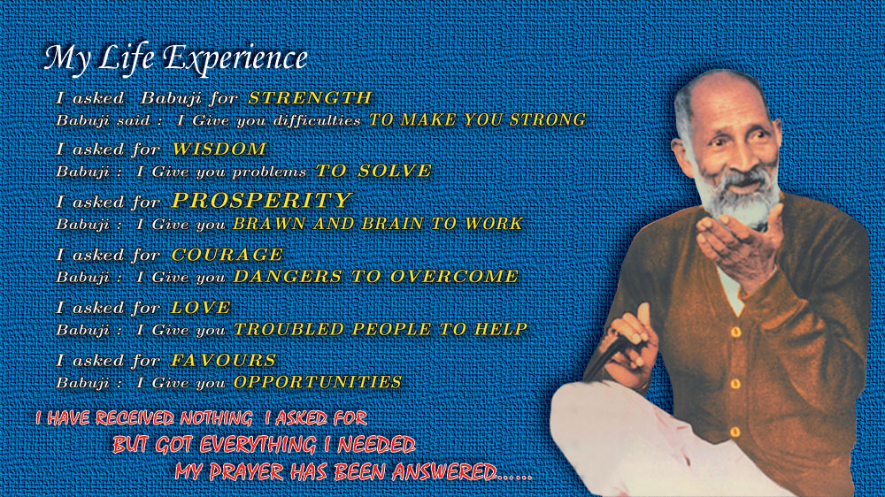 We want no name - We want to be an action without a form & fame. Through our Guru's will, the desire for Name & Fame has not yet crept into our hearts and we dare to say never will. We are instruments and he is the operator. Through these (A team of dedicated Abhyasis) He - Our Divya Gurudev Babuji Maharaj rousing the Spiritual instint in thousands of "Hearts" on this planet earth.